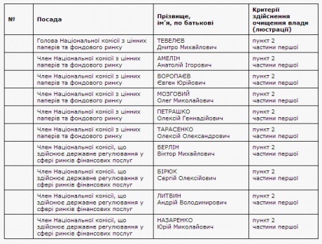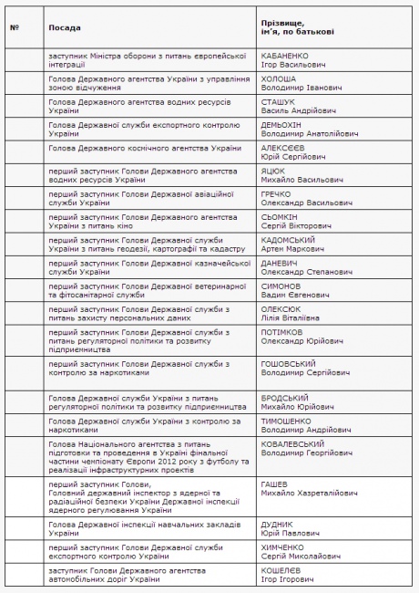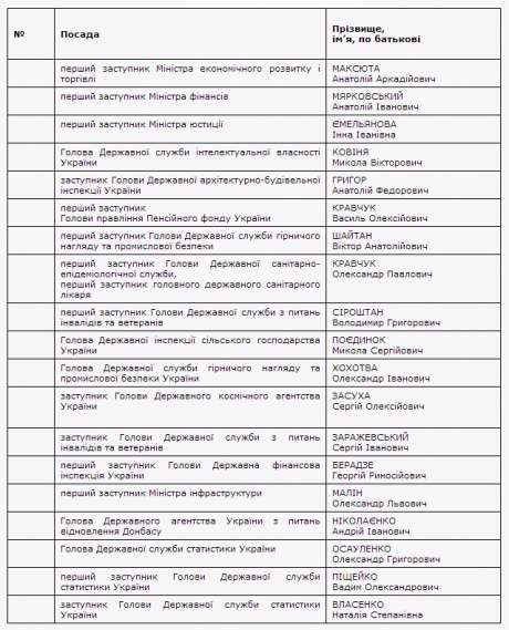 Список складається з декількох частин. У першій вказаний 21 високопосадовець центральних органів виконавчої влади, які звільнені відповідно до закону про люстрацію.