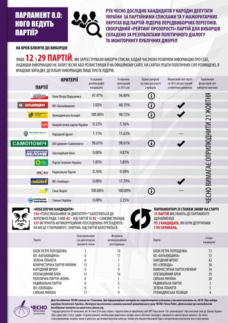У той же час до найбільш прозорих політичних сил можна віднести відносно "старі" партії – "Громадянську позицію", "Блок Петра Порошенка" та "Батьківщину", а також нові для парламенту політичні сили – Об’єднання "Самопоміч" та партію "Сила людей".