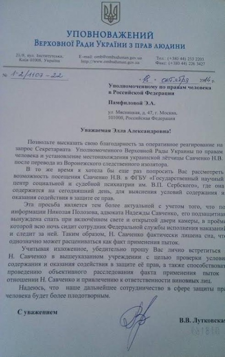 Омбудсмен Валерія Лутковська на підставі інформації про тортури повторно звернулась до російського омбудсмена з вимогою здійснити особисту зустріч із Надією Савченко.