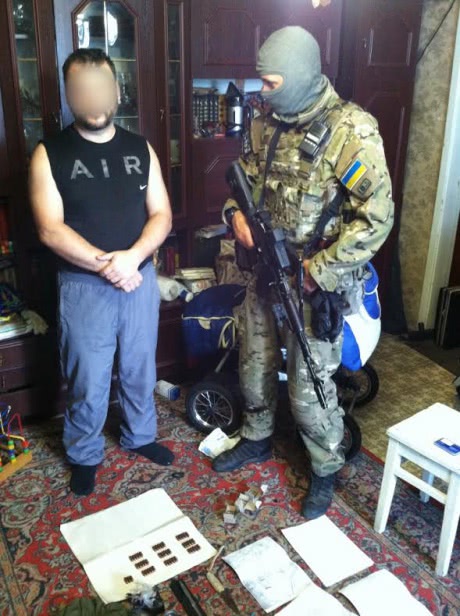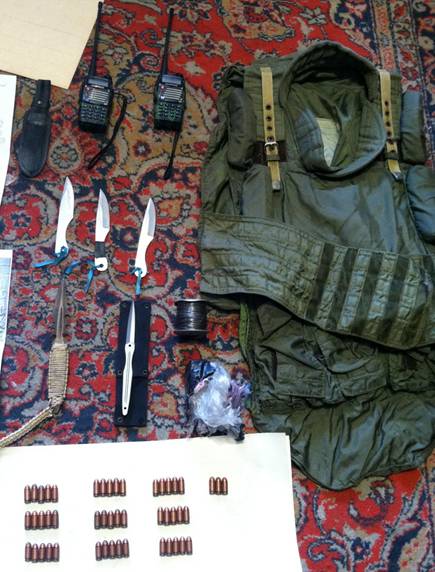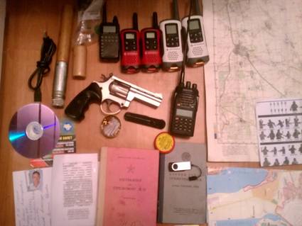 Під час обшуків у помешканнях затриманих Служба безпеки вилучила пістолети, боєприпаси до них, вибухові пакети, холодну зброю, прилади дистанційного управління для вибухових пристроїв, топографічні карти місцевості та спеціальну військову літературу.