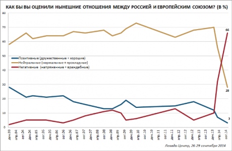 Сума негативних почуттів серед населення Росії до США і Євросоюзу досягла максимального значення за всі роки замірів.
