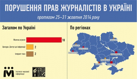 Відзначається, що в період з 25 по 31 жовтня в Україні було зафіксовано 10 випадків порушень прав журналістів, зокрема: фізична агресія, (з них 4 - в Херсонській області), цензура і відмова в доступі до інформації (2 випадки) та інтернет- тиск (2 випадки).