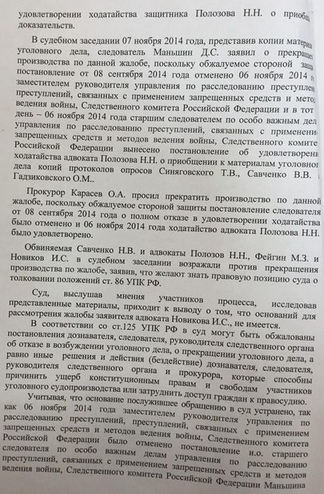 "Суд припинив провадження за скаргою у зв'язку з тим, що СК скасував свою постанову й прилучив докази невинуватості Савченко до справи", - повідомив адвокат Микола Полозов.