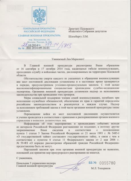 Про це йдеться в офіційній відповіді Головної військової прокуратури на запит депутата Псковсьих обласних зборів Льва Шлосберга.