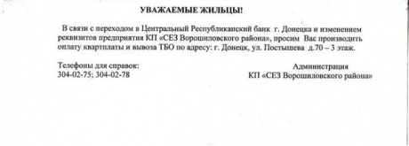 "У зв'язку з переходом в Центральний Республіканський банк м.Донецька і зміною реквізитів підприємства КП" СЕЗ Ворошиловського району ", просимо Вас проводити оплату квартплати та вивезення ТПВ за адресою: м.Донецьк, вул. Постишева д. 70 - 3 поверх", - зазначається в оголошенні.