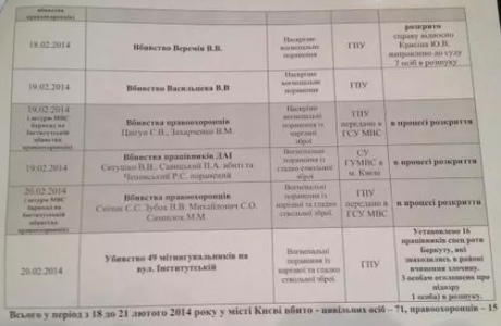 Окрім того, Геращенко оприлюднив деталі інших розслідувань злочинів, скоєних 18 – 20 лютого на Майдані. Зокрема, за його інформацією в ніч на 18 лютого на Інститутській загинули 13 осіб.