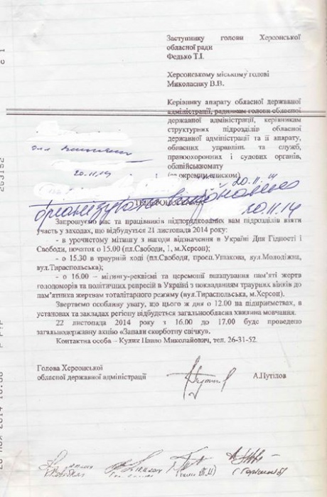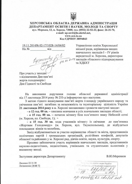 Подібні запрошення з проханням "забезпечити участь керівників навчальних закладів, представників науково-педагогічних, педагогічних, учнівських та студентських колективів" розіслав і департамент освіти ОДА по навчальних закладах.