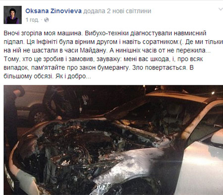"Вночі згоріла моя машина. Вибухо-техніки діагностували навмисний підпал. Ця Інфініті була вірним другом і навіть соратником:(", - написала Зинов’єва.