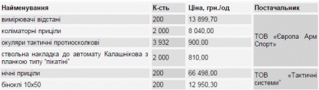 За даними "Вісника державних закупівель", замовлено нічні й коліматорні приціли, біноклі, проти осколкові окуляри, вимірювачі відстані,а також накладки до автомату Калашнікова з планкою типу "пікатіні".