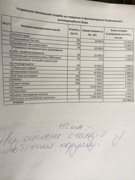 Він опублікував документ, згідно з яким на Національне антикорупційне бюро потрібно майже 120 мільйонів гривень, а на Національне агентство з запобігання корупції – 112 мільйонів гривень.