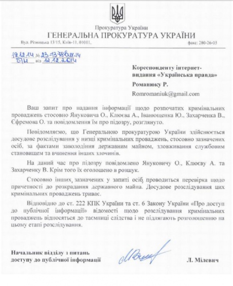 Як ідеться у відповіді, "на даний час про підозру повідомлено Януковичу О., Клюєву А. та Захарченку В.". "Крім того їх оголошено у розшук", - повідомили в ГПУ.