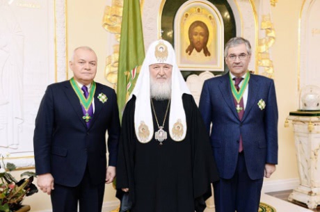 Патріарх РПЦ Кирил нагородив орденами телеведучого і гендиректора російського інформагентства "Россия сегодня" Дмитра Кисельова, а також гендиректора ВДТРК Олега Добродєєва.