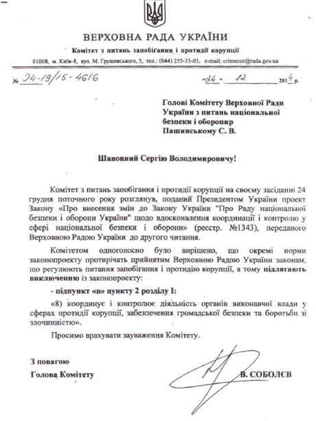 Комітет просить не давати РНБО контроль по боротьбі з корупцією