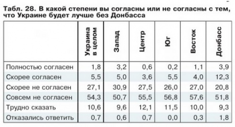 При цьому 7,3% українців не проти виходу Донбасу зі складу країни. Найбільше бажаючих - на Закарпатті (16,5%), у Чернівцях (13,5%), Миколаєві (13,1%), на Галичині (9,8%) та Запоріжжі (8,4%).