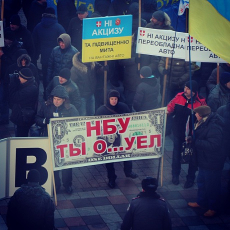 Присутні вимагають від парламентаріїв дотримуватися законів і поважати Конституцію України і тримають плакати: "Забирайте кошти у офшорів, а не у бізнесу", "ні ПДВ-рахунками", "Ні акцизу на переобладнання авто", "Ні акцизу і підвищенню мита" та інші.