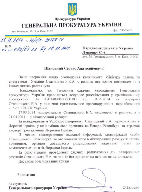 "З метою підтвердження вказаної інформації. Ідентифікації особи Ставицького-Розенберга та оголошення його в міжнародний розшук за новим прізвищем" ГПУ звернулась до Ізраїля.