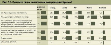 Разом з тим сентенція "Крим для України втрачено назавжди" розділяють 23,5% опитаних респондентів, найбільше (49%) у цьому впевнені на Донбасі, на сході (31,8%) та на півдні країни (30,2%).