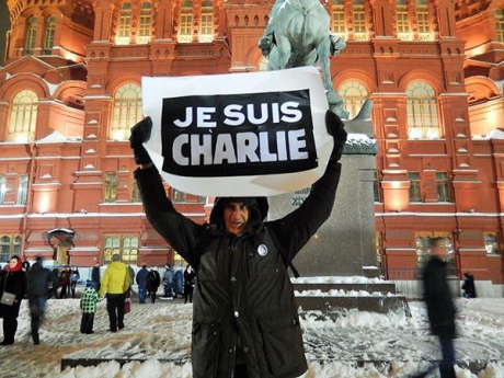 У Москві на Манежній площі поліція затримала активістів, які проводили одиночні пікети, а один з них стояв з плакатом на підтримку жертв теракту у Парижі з написом "Je suis Charlie".
