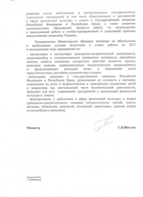 "Міністерство спорту Республіки Крим інформує про закінчення Перехідного періоду в Республіці. Міністерство просить забезпечити неухильне дотримання поваги усіма працівниками та вихованцями державних установ організацій та підприємств у сфері фізичної культури і спорту до державних символів Російської Федерації та Республіки Крим", - повідомляється в наказі.