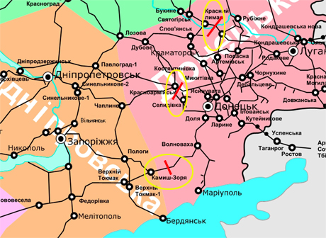 | Так виглядає карта залізничного сполучення на Сході. Крайні точки - Красноармійськ, Бердянськ, Красний Лиман |
