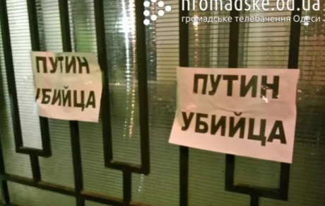 Учасники акції звинуватили очільника Кремля у організації атаки проти цивільних у Маріуполі зокрема та в Україні загалом. На паркан консульства причепили написи "Путин убийца".