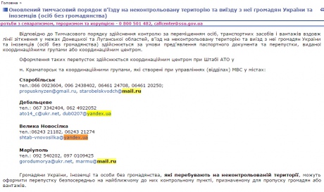 Так, у п'ятницю 23 січня на сайті СБУ з'явилося повідомлення про тимчасовий порядок в'їзду та виїзду з зони АТО, де було вказано в якості контакту дві поштові адреси на mail.ru – [email protected], [email protected], а також два на українській версії російського "Яндекса" – [email protected] та [email protected].
