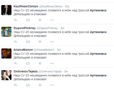 В той же час, через хвилин 40 після появи перших повідомлень про вибухи, які чули в районі Артемівська, в соціальній мережі Твіттер почалася атака ботів з одним і тим же текстом "Наш СУ-25 несподівано з'явився в небі над трасою Артемівськ-Дебальцеве і атакував ".