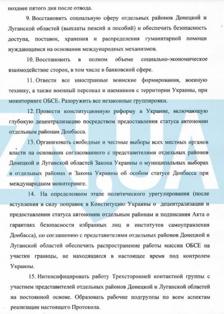 - відведення важкого озброєння (калібр більше 100 мм) на другий день після припинення вогню за сприяння ОБСЄ (при цьому бойовики пропонують відвести українське озброєння від фактичної лінії зіткнення, а "ДНР" і "ЛНР" відведуть від лінії 19 вересня за Мінським меморандумом);