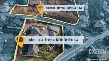 Як з’ясували журналісти, ділянки Порошенка й Кононенка мають спільну адресу і розташовані через дорогу на вулиці Радіальній, 5 у Києві, в елітному поселенні Царське село.