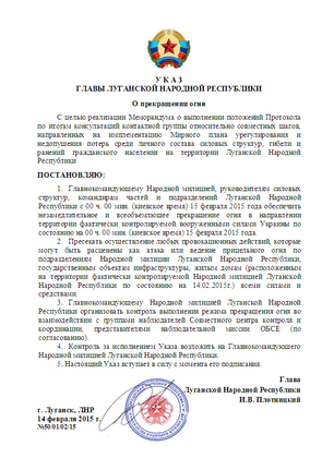 "Луганська народна республіка" готова виконувати домовленості, підписані у Мінську 12 лютого. Припинити бойові дії по всій лінії фронту з нуля годин за київським часом... Відповідний документ - указ - був підписаний сьогодні, і накази були віддані військовим підрозділам "ЛНР" про припинення вогню і відведення техніки", - заявив він.