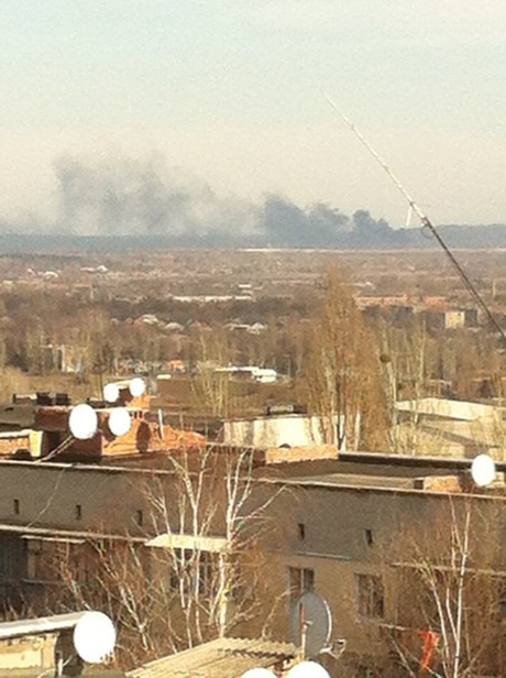 "Жителі міста, що живуть на верхніх поверхах багатоповерхівок повідомляють, що близько години тому на північний схід від Слов'янська з'явився величезний стовп густого диму. Дехто зауважує, що перед цьому чули два хлопки. От уже протягом години дим не зникає", - повідомляє видання.