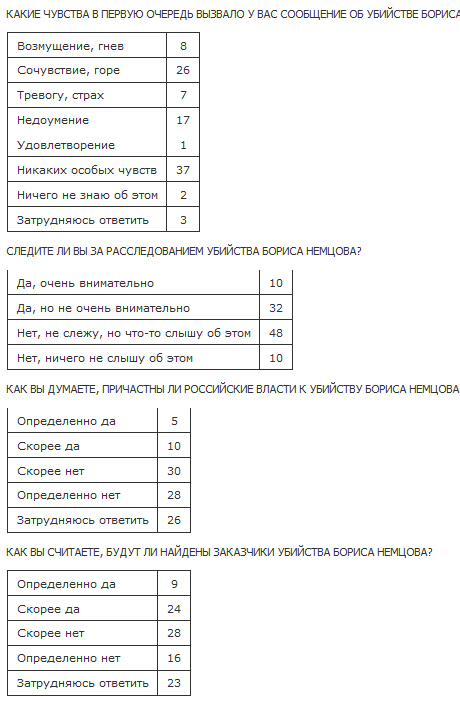 33% опитаних вірять у те, що замовники вбивства будуть знайдені, 44% в це не вірять. 48% росіян скептично підходять до ймовірності встановлення правди про мотиви та замовників вбивства.
