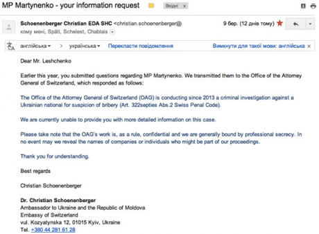 "З огляду на те, що кримінальні справи у Швейцарії є секретною інформацією, в цьому листі завуальовано, але водночас досить однозначно підтверджується справа проти Мартиненка", - додав Лещенко.