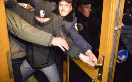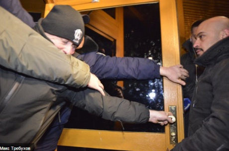 Відштохвнувши нардепа від входу до будівлі, люди у камуфляжі закрили двері і не виходять на вулицю.