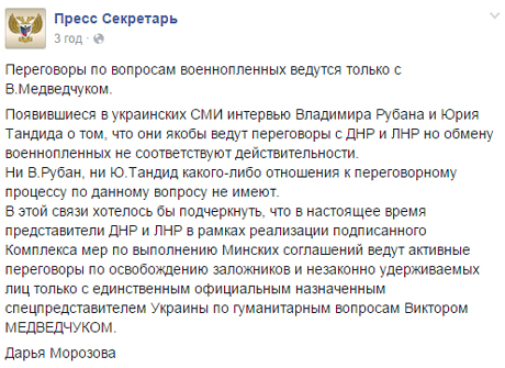 При цьому, вона заявляє, що твердження про те, що Володимир Рубан та Юрій Тандід ведуть переговори з формуваннями "ДНР" та "ЛНР" щодо обміну військовополонених не відповідають дійсності.