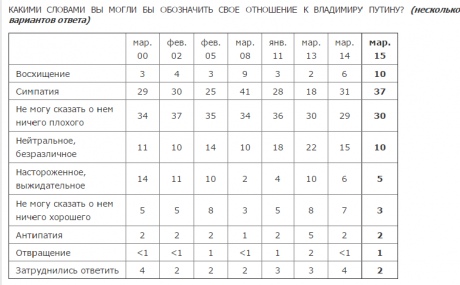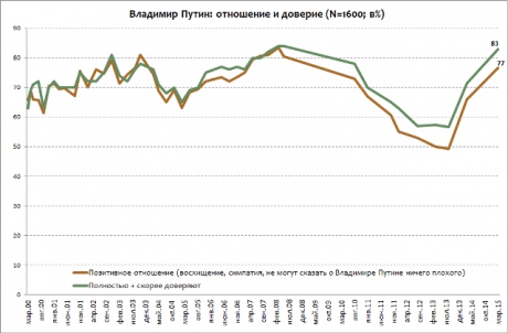 Також у ході опитування 70% росіян заявили, що той факт, що в руках Путіна зосереджена практично вся в країні, йде лише на благо Росії. Що це не скінчиться добром заявили 15%.