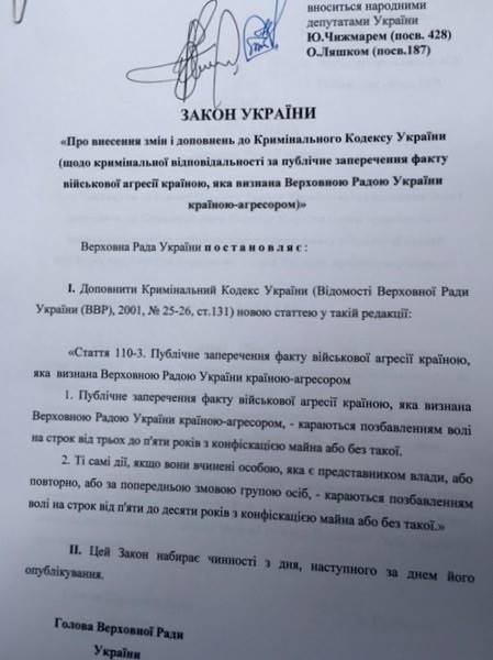 Автори документу – нардепи Олег Ляшко та Юрій Чижмар, який і розмістив копію законопроекту у Facebook.