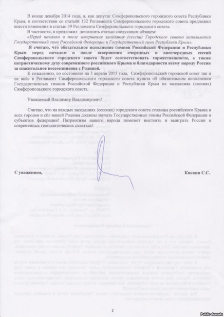 Депутат окупаційної міськради Сімферополя від КПРФ Степан Кіскін поскаржився Путіну, що депутати не прийняли його пропозицію виконувати гімн Росії на початку і в кінці засідань.