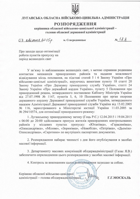 Відповідне розпорядження 7 квітня підписав керівник Луганської військово-цивільної адміністрації Геннадій Москаль, повідомляється на його сайті.