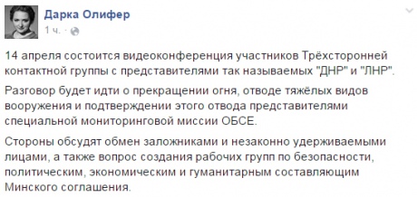 Водночас представник "ДНР" на переговорах у Мінську Денис Пушилін заявив, що проведення очної зустрічі контактної групи в Мінську можливо, якщо на відеоконференції 14 квітня вдасться домовитися про формування підгруп.