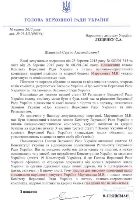 "Тому підстав для внесення пропозиції щодо відкликання народного депутата Мартиненка М. В. з посади голови комітету ВРУ з питань паливно-енергетичного комплексу, ядерної політики та ядерної безпеки на даний час не вбачається", - додав спікер.