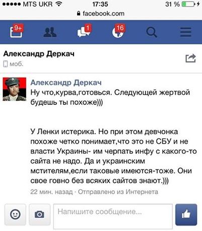 "Ось і робота для СБУ та МВС. Погрози на мою адресу. Пишу заяву і відправлю рекомендованим листом. А нашому фейсбучному Арсену Авакову і Фейсбуку буде достатньо. Ловіть, розслідуйте. Поки вас не відправили з ганьбою у відставку", - заявила Бондаренко, оприлюднивши скрін-шот повідомлення з погрозами.