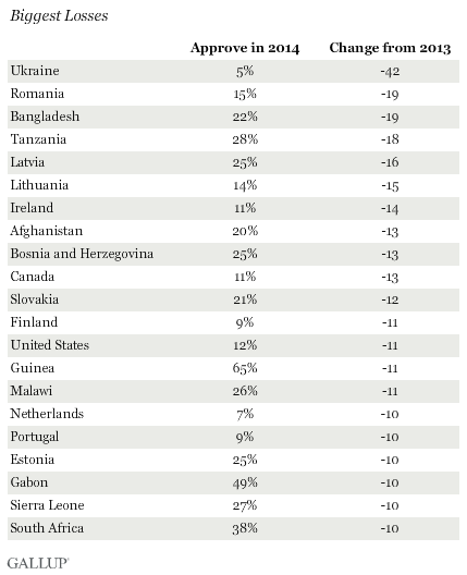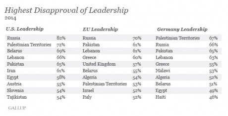 Росія у 2014 році увосьме поспіль зайняла останнє місце у всесвітньому рейтингу схвалення дій керівництва держави, складеному американським інститутом дослідженням громадської думки Gallup.
