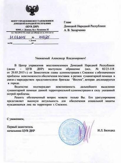 За словами працівників "ЦУВ ДНР", "військовослужбовці "Востока", які дислокуються на території Сніжного, займаються пограбуваннями гуманітарних вантажів".