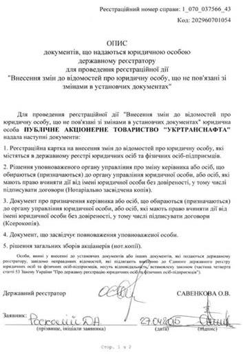 Колишньому голові "Укртранснафти" Олександру Лазорку було доручено передати, а Сидораку прийняти до 15 години 23 квітня 2015 року документи, майно та інформацію ПАТ "Укртранснафта".