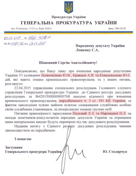 "23.04.2015 управлінням сперозслідувань Головного слідчого управління ГПУ до єдиного реєстру досудових розслідувань внесено відомості про вчинення кримінального правопорушення, передбаченого ч 3 ст 191 КК за фактом заволодіння чужим майном шляхом зловживань службовою особою своїм службовим становищем за попередньо змовою групою осіб", - сказано у відповіді.