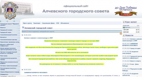 На офіційному сайті міської ради Алчевська з'явилася заява про вихід міста зі ЛНР".