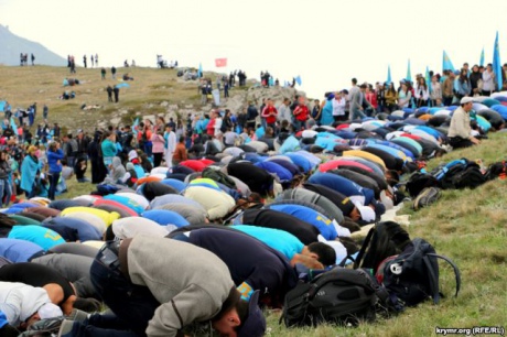 На вершині учасники сходження помолилися в пам'ять про загиблих під час депортації 1944 року, а також виконали національний кримськотатарський гімн. Після колективного фото під прапорами присутні рушили назад.