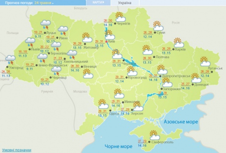 За даними Укргідрометцентру, 24 травня без опадів, лише в західних областях місцями короткочасний дощ, гроза, в окремих районах град та шквали 15-20 м/с.