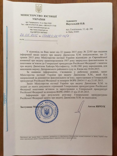 Міністерство юстиції України направило до Генеральної прокуратури Росії запит про видачу сина уповноваженого президента у справах кримськотатарського народу депутата ВР Мустафи Джемілєва Хайсера.